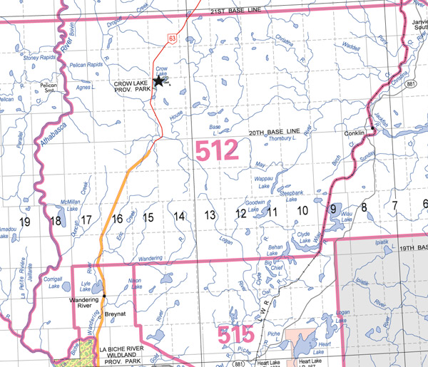 Crow Lake Wildlife Management Unit (512) Commencing at the intersection of the right bank of the Athabasca River and the 21st baseline; thence easterly along the 21st baseline to the Canadian National Railway railway line near Janvier; thence southwesterly along the railway line to the intersection with the 19th baseline; thence westerly along the 19th baseline to the northwest corner of township 72, range 17, west of the fourth meridian; thence southerly along the range line to the right bank of the La Biche River; thence westerly along the right bank of the La Biche River to the right bank of the Athabasca River; thence downstream along the right bank of the Athabasca River to the point of commencement. |